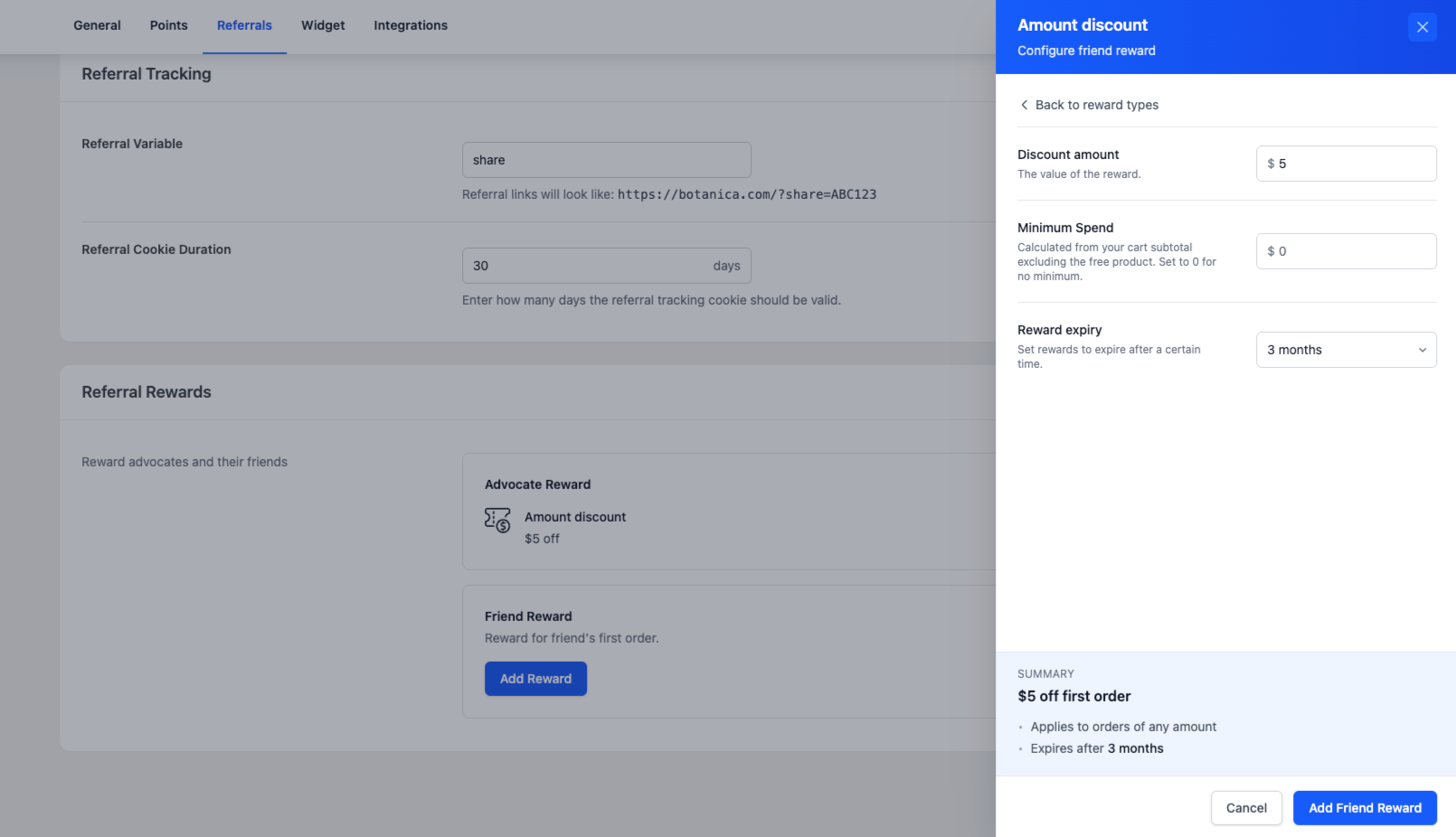 Lors de la détermination de cette valeur, gardez à l'esprit que l'ami est un visiteur pour la première fois qui ne fait pas encore confiance à votre marque. La récompense doit être suffisamment attrayante pour surmonter l'hésitation naturelle à acheter auprès d'un nouveau magasin. Une récompense qui semble trop petite par rapport aux prix de vos produits peut ne pas convertir, tandis qu'une récompense trop généreuse peut éroder les marges.