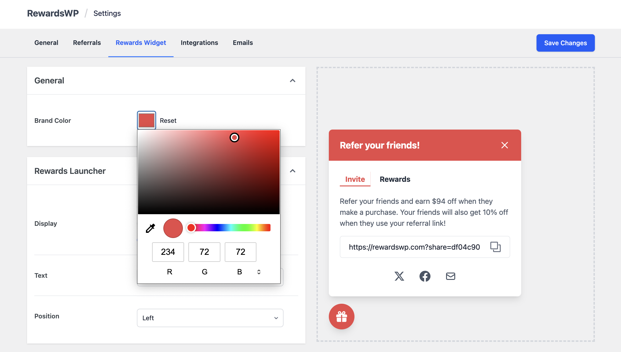 {site_name}や{referral_link}などのプレースホルダーを使用してメールメッセージをパーソナライズします。例:「喜びを分かち合いましょう!{site_name}に友達を紹介して、次回の注文を10ドルオフにしましょう。ここをクリックしてください:{referral_link}」報酬ウィジェットにはリアルタイムプレビュー機能が含まれており、変更を加えながら確認できるため、保存する前に完璧に見えるようにすることができます。