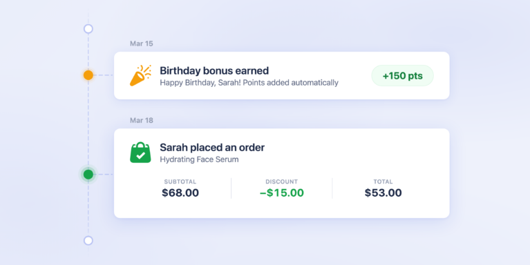Se ele visitar sua loja por conta própria, abre o Widget de Recompensas e um banner de celebração o cumprimenta pelo nome: “Feliz Aniversário Sarah! Aproveite 150 Pontos por nossa conta.” De qualquer forma, os pontos estão lá.